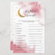 Tvätta över temat babydusch baby ord med skrampkort för måne med vattenfärg stänk i rosa med faux guld måne och stjärnor. Listan över ord på detta kort gäller spädbarn, och den är uppdelad. Gästerna kommer att tävla, som kan lösa upp alla först! SVAR NYCKEL: 1. bilsäte 2. mjölk 3. lekplats 4. nappar 5. blöjor 6. rockstol 7. dagis 8. baby monitor 9. svalg 10. formel 11. gummiducky 12. barnvagn.