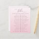 Det här söta "Would You Rather"-spelkortet kommer att underhålla gästerna på din dotters Sweet Sixteen-födelsedagsfest. Det har en rosa och vit gradientbakgrund. Titeln lyder "Skulle [namn] hellre...?" som du kan ersätta med födelsedagsflickans namn. Nedan finns en lista med roliga alternativ, t.ex. "Tidigt till sängs eller uppe hela natten". Lägg till alternativ som är relevanta för din födelsedagsflicka. . Bläddra i min kollektion för matchande kuvert och brevpapper. ••• För fler födelsedagssatser, besök min butik, Zazzle.com/EventsByJessicaAmber ••• För specialbeställningar, skicka ett meddelande till mig på Zazzle