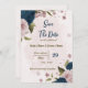 Snygg romantisk inbjudan från bröllop spara datum med rosa och blåa blommor och lite löv. OM DU VILL HA MER MATCHING PRODUCTS klickar du på samlingen ovan eller kontaktar mig