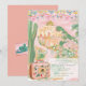 Denna destination bröllop Spara datumet har målad konst av en mexikansk stadsscen med papel picado banderoller överst. Alla viktiga detaljer om bröllopet kan anpassas. Färgerna inkluderar grönt, rosa, blått, vitt och korall.
