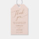 Minimal och enkel bröllopsförmånlig märkre med modern skripttext som säger "tack" överst på en rosa.