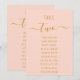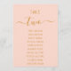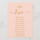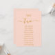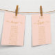 Överst står bordsnumret skrivet med handskriven stil och ordet Bord ovanför, med mindre versaler (handskrivna bokstäver). Under dem finns de 10 gästnamnen, i liknande handskrivna bokstäver. All text är röd, bakgrunden är rosafärgad.