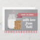 Ett bedårande modernt tackkort med randigt mjölk och kakor som är perfekt för en babyfest. Färgerna är grå, rosa och vit. Det är en modern touch. Designen har en hög stapel med chokladkakor och en flaska mjölk.