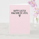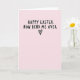 Det här kortet har en mjuk pastellrosa bakgrund med en busig högtids hälsning i fet, avslappnad svart text över den övre mittersta delen. Texten ser lite ojämn ut, som om den snabbt skrivits ned av någon nära dig, vilket ger den en intim, konspirativ ton. Meddelandet är centrerat med generöst med öppet utrymme runt omkring, så att orden får göra det mesta av snacket utan extra dekorationer. Strax under texten lägger en liten svart hjärtsilhuett till en mjuk romantisk ton, som en tyst blinkning mellan partners eller nära vänner. Den söta rosa bakgrunden kontrasterar med den djärvare linjen och skapar en flirtig dragkamp som känns både tillgiven och skojfrisk. En liten 🌷 detalj kan lätt tänkas ligga vid sidan av den mjuka färgpaletten, vilket förstärker den säsongsbetonade känslan utan att tränga