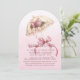 En underbar inbjudningskort för möhippan av ett söt rosa- och krämparaply med rosett band och blommor. Bakgrund är en övertoningstext och rosa som visas i burgundi. Känd vit papper med en bågformig form.
