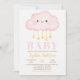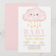 Inbjudan till rosa Molnflicka Baby Shower. Den här inbjudan firar att du är i mamma med den här söta och enkla moderna babyduschdesignen med ett Rosa moln med gult stjärnor. Den här inbjudan till Rosa Cloud Girl Baby Shower är perfekt för ditt moderna och söta evenemang!