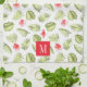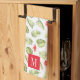Monogrammad, vit kökshandduk med rosa monogram en söt grönt botaniskt tropiskt handflatan lämnar design av mönster och rosa exotiska blommor.