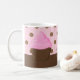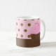 En smaskig tittar chokladmuffin överträffas med fluffig rosa glasyr på kaka och är på ett ljust - rosa bakgrund med brun polka dots.