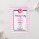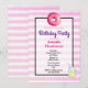 En fin, fantasifull och söt födelsedagsinbjudan. En rosa och vit randig bakgrund. Överlagd är en halvgenomskinlig överdrag med svart kant. En rosa glaserad munk med strössel överst och ett glas uppfriskande lemonad längst ner. Anpassa med dina födelsedagsdetaljer.