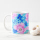 Den här färgstarka konstruktionen har vacker rosa och pulserande blåa blommor mot en ljusblå bakgrund.