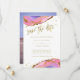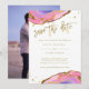 De här eleganterna, de moderna bröllop spara datum-korten, har trendigets rosa och de blå geodetiska färgstenarna med handskript och accenter från Faux guld. Ditt personliga foto går på baksidan.