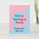 Är du ett roligt älskande par som väntar på baby? Den här söta inbjudan till en gender avslöjar att party säkert skrattar. Rosa och blått med texten: "Vi har ett party. Kom för sex. Inuti finns en inbjudan till en gender som visar party.