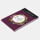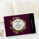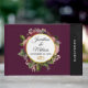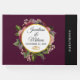 En bröllop-gästbok med burgundbakgrund. Designad med en cirkel som har en faux-guld-folie gräns som läggs ovanpå en söt blommigt bukett av ro, nejlikor och andra blommor. Anpassa med texten inuti cirkeln. Ett par guld bröllop ringar under texten.