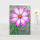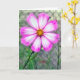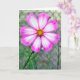 En ljus rosa- och vit kosmos-blomma står ut mot en suddig bakgrund av kedjelänkarna. Den inre texten kan redigeras.