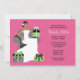 Inbjudan är gästerna för en möhippa i stil med detta moderna och roligt inbjudningskort för möhippan. Denna inbjudan till rosa och grönt innehåller en afrikansk amerikansk brud sitta på en stol omgiven av gåvor.