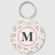 En nyckelkedja med din anpassningsbar monogram initialt i en eggshell-vit färgad ram med en rosa prickad gräns. Inledningsvis skrivs ett fet teckensnitt. Bakgrunden är en mönster av vilda blommor från hand plockade rosa med långa gröntar och löv på en äggskal vit färgad baksida. Rosa cirklar och spritar dekorerar också designen. Utformning av blommigt och söt.