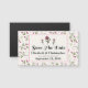 Ett magnetiskt affärskort med bröllop spara datum-design. Med din anpassningsbar inskriven i en eggshell-vit färgad ram med rosa gräns. 3 enskilda blommor ovanför texten. Bakgrunden är en mönster av vilda blommor från hand plockade rosa med långa gröntar och löv på en äggskal vit färgad baksida. Rosa cirklar och spritar dekorerar också designen. Utformning av blommigt och söt.