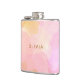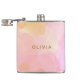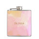 Denna stilfulla platta flaska har en mjuk rosa och persikorosa abstrakt akvarelldesign med varma gyllene undertoner och ett modernt personligt namn i snygg guldtext. Det är ett chic tillbehör för möhippor, brudtärnsgåvor eller stora födelsedagsfiranden. En trendig och feminin pjäs perfekt för roligt på språng.