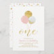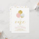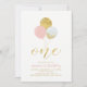 Fira en speciell dag för din älskade med den här söta första födelsedagsinbjudan! Den här designen har snyggt-typografin "One" med ballonger och konetti i kombinationen rosa, grått och guld färg. Matcha din inbjudan till dekorationerna för födelsedagsfesten. Perfektens inbjudan till en modern första födelsedagsfest för en tjej.