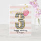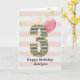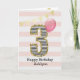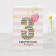 Ett rosa och guld födelsedags kort för en 3-åring, som du kan personliggöra med hennes namn. Framsidan av detta vackra födelsedagskort för henne visar siffran tre i en svart-vit randig design med en kontur av glitter och en rosa ballong som är redo att flyga iväg. Observera att guldglittret är en designeffekt och att det inte kommer att finnas något verkligt glitter på detta födelsedagskort. Bakgrunden är en mjuk vit och rosa med en guld-festflagg-banner högst upp. Det går enkelt att personliggöra meddelandet på insidan om du önskar. Ett vackert 3-års födelsedagskort att spara för henne.