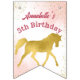 Hästhästen rosa och guld riddare, cowgirl Grattis på födelsedagen som buntar flaggor. På första och sista flaggor kan du sätta dina flickor namn.