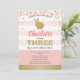 Rosa och guld söta kanintema födelsedagsinbjudan för flickor 3 år. Elegant modern chic rosa och vita ränder.