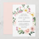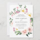 Elegant, bröllopsinbjudningar för blommigt med dina bröllop-detaljer som är utformade av rosa, lila och vita vattenfärgblommor (peonier & ro) och lush grönt eucalyptus löv. Den feminina blommigtens bröllopsinbjudningar går tillbaka till en lätt rosa bakgrund.