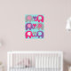 Elefant kärlek barnkammare affisch visar sex elefanter i grått, rosa och lila med mönstrade öron på en turkos blå prickig bakgrund!