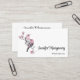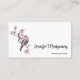 Affärskort med en vattenfärgsmålning. 2 rosa och svart fåglar sitta vid träd gren med rosa blommar.