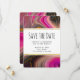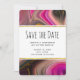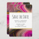 Bröllop spara datum-kort med en groovy tittar abstrakt design. Blanda rosa och svart färg och blanda ihop dem i ett snurrande rörelse. Sprinkler av faux guld glitter mellan lagrar. En rektangel ram med faux guld-folie överst med personligen inuti.