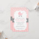 Elegant och skolflickduschinbjudan. Den har en rosa barnvagn med polka dots mönster, en bakgrund som består av två mönster, en rosa och vit schevron och rosa rand. Den innehåller också ett vitt centrum med stygn effekt för att ange uppgifter om party. Detta enkla inbjudningskort med sin rosa-, vit- och grått-palett är perfekt för alla som planerar en barndusch eller behöver ett meddelande om att en nyfödd flicka ska komma. Inbjudningskort kan enkelt vara personlig med din party-information.