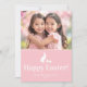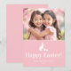 Desteis pastellrosa påskkortmall med en kaninsiluett och två påskägg i vit färg. Den övre halvan är en fotomall för ett anpassat familjefoto och den nedre visar ett ”Glad påsk!”-meddelande med utrymme för familjenamn och år. Perfekt för att skapa en söt, personlig påskhälsning. Baksidan av kortet är rosafärgad.