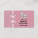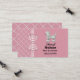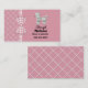 Söt kort för nätverkande mammor med rosa bakgrund till höger, och ett rosa och vitt gallermönster till vänster och på baksidan. Ett grafik med rosa och vitt gingham-band löper vertikalt mellan de två bakgrunderna och är dekorerad med en gingham-slinga. En söt, fluffig vit pudel dekorerar det övre högra hörnet på kortet, med svart text under. Anpassa detta roliga kort som ett bra sätt att hålla kontakten med andra mammor för att planera fester, lekdatum och barnvakt.