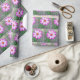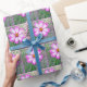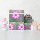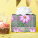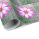 En ljus rosa- och vit cosmos-blomma står ut mot en suddig bakgrund av kedjelänkarna