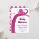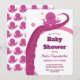 En inbjudan till babydusch med leende, rosa, bläckfisk. Den lilla bläckfisken hålls upp av arm i en större bläckfisk. Baksidan av inbjudan visar en mönster av små bläckfiskar. Hela ord kan anpassas.