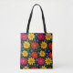 En livlig trädgård av färg blommar mot en djup svart bakgrund, med blommor i rosa, gul, orange och röd-orange, inramade av mjuka gröna blad och accentuerade med små blå blommor som ger en lekfull kontrast. Den djärva färgpaletten och den rena symmetrin skapar en glädjefull, iögonfallande design som känns både modern och lekfull - perfekt för att lysa upp vardagliga ärenden eller lägga till en touch av konstnärlig charm till din look.