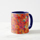 En chic Kaffe Mugg med Mörk blått läppar och handtag och Orange, Gult och Rosa poppies på en Himlar Blue-bakgrund (utmärkt gåva till vem som helst med en August Birthday eller vid namn Poppy). Från ett handmålat pappert kollage av Judy Adamson, är den här lysande blommigten en del av "Poppy Fält-samlingen" Posh & Painterly.