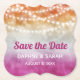 Spara datumet pappert underlägg för en lesbisk bröllop med rosa, vit och orange ombre bakgrund och söt fairy ljus. Lägg till datum för namn och bröllop.