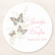 Vackra tre konstfjärilar och blommigt snurra i rosa, kräm, akvatal och brunt, minneshögtid över bröllop pappra underlägg. Ett underbart personligt tillskott till bord i bröllop eller till efter bröllop. Anpassa med din brud och putsar namn. Perfekt för fjärilsmassa eller trädgårdsbröllop. Sarah Trett målade på ett unikt sätt i vattenfärg och design.