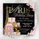 Paris födelsedagsinbjudan med vacker gyllene Eiffeltorn, eleganta Paris presentförpackningar, gyllene glitter högklackade skor och elegant gyllene Paris skrift på en rik rosa och svart blomsterbakgrund. Denna vackra Paris födelsedagsinbjudan kan enkelt anpassas för ditt evenemang genom att helt enkelt lägga till dina uppgifter i den typsnittsstil och färg samt formulering du väljer. Detta är en tryckt design utan riktiga diamanter, smycken, glitter etc.