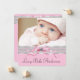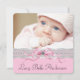 Bedårande rosa spets, band, pärlor och rosett bebis födelsedagsannonser. Denna vackra rosa och svarta födelseannons är lätt att anpassa med ditt foto och detaljer genom att lägga till ditt foto, händelseinformation, typsnitt, teckenstorlek och färg samt formulering.