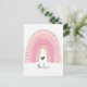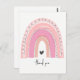 Kort med handskriven typografi som säger "tack" med vacker rosa pastell regnbåge och ett svart hjärta och krulliga linjer.