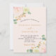 En ljus och mejeribakgrund i ro guld. Dekorerad med vattenfärgade blommor, blommigt rosa ros, vita orkidéer och en ljusgrobera av gult, eukalyptus greenery och faux guld sprigs. Anpassa och lägg till information om namn och bröllop. Svart färgad brev. Bakåt: ro guld.