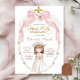 Rosa Pearl First Heliga Communion Investigation, Rosa Boho Bow Coquette Girl First Heliga Communion bjudation, White Blommigt Rosa Ribbon First Heliga Communion Investigation,