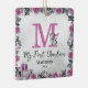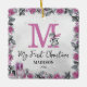 Cute baby monogram rosa christmas-ornament med tvättat grått-bakgrund, elegant vattenfärgsfärgade blommigtar och blad, vidsträckta baby-penguiner, julafton, gåvor, snögubbe-nybörjare, barn, år, ordspråket "mina första julklappar" och namn.