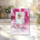 Kom ihåg din kära och fira deras liv med det söt Rosa Peony Flower Funeral Folded Program. Den här tidslinjen för anpassningsbar av blommor i eleganten innehåller ett digitalt målat foto av blommigt av rosa-peonblommor i magenta med en vit övertäckning av blommarna. Anpassa den med en bild av det avlidna, födsel och död data och ceremonin för deras firande i livets gudstjänst.
