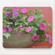 Rosa petuniasspill över en dekorativ planter mot en röd vägg som skapar designen för denna ljusa mousepad.