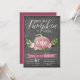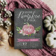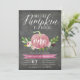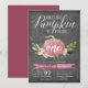 Falla för dessa rustika och eleganta födelsedagsinbjudningar för barn. Designen har en rosa akvarellpumpa prydd med burgunderröda och elfenbensvita blommor och grönska på en svart tavla-bakgrund. "Vår lilla pumpa blir" visas högst upp i elegant kalligrafiskrift, med ditt barns ålder ingraverad på pumpen. Exemplet visas för en ettårsdag. Anpassa med dina födelsedagsdetaljer nedan i vit text. Kortens baksida är i enfärgat burgunderrött marsalafärg.