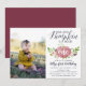 Falla för dessa söta lantliga barnkalenderinbjudningar med ett favoritfoto på vänster sida. Designen har en rosa akvarellpumpa prydd med burgunderöda och rosa blommor och grön lövverk. "Vår lilla pumpa fyller år" visas högst upp i elegant kalligrafiskrift, med ditt barns ålder ingraverad på pumpen. Exemplet visas för ett första födelsedagsfirande. Anpassa med dina födelsedagsdetaljer nedan i rik blåskrift.