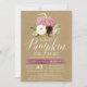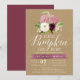 Fylls av kärlek till dessa rustika och eleganta höst-inbjudningar till baby shower. Designen har en rosa akvarellpumpa dekorerad med burgunderröda och elfenbensvita blommor och grönska på en kraftbakgrund. "En liten pumpa är på väg" visas längst upp i elegant kalligrafiskrift. Anpassa med din baby shower och önskelista längst ned i vit text. Baksidan på korten har en enfärgad burgunderfärg.